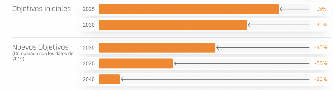 Si anteriormente se fijaban dos periodos de tiempo para cumplir con los objetivos de reducción (2025 y 2030), ahora se tendrían tres (2030, 2035 y 2040). Pero no solo cambian los plazos, también lo hacen los porcentajes, que serían ahora bastante más elevados que los que se marcaron en 2019. Por ejemplo, si nos fijamos en la última fecha marcada, se pasaría de buscar un porcentaje de reducción final del 30% para 2030 a un 90% para 2040.